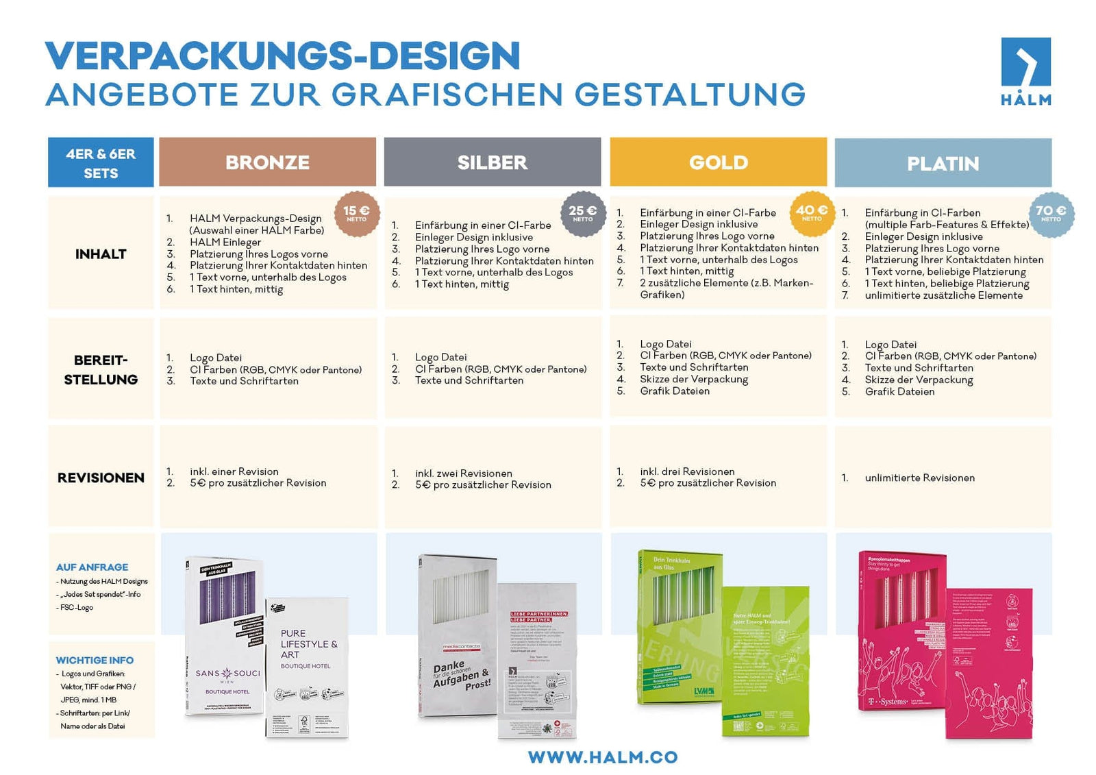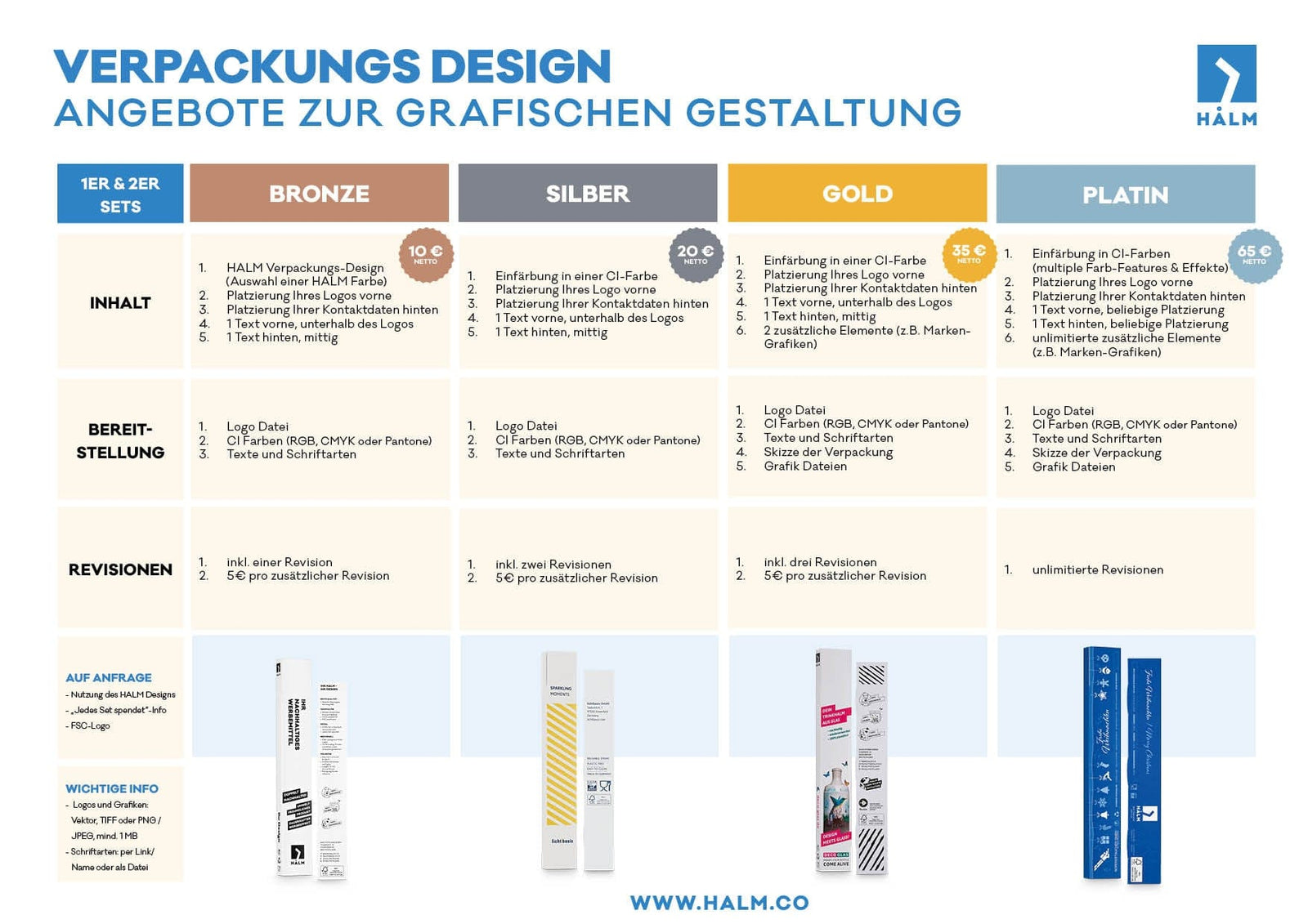 Benefíciese de nuestra experiencia HALM diseñadores gráficos . Póngase en contacto con nuestro equipo para obtener una oferta personal para crear un diseño de embalaje individual de acuerdo con sus deseos.